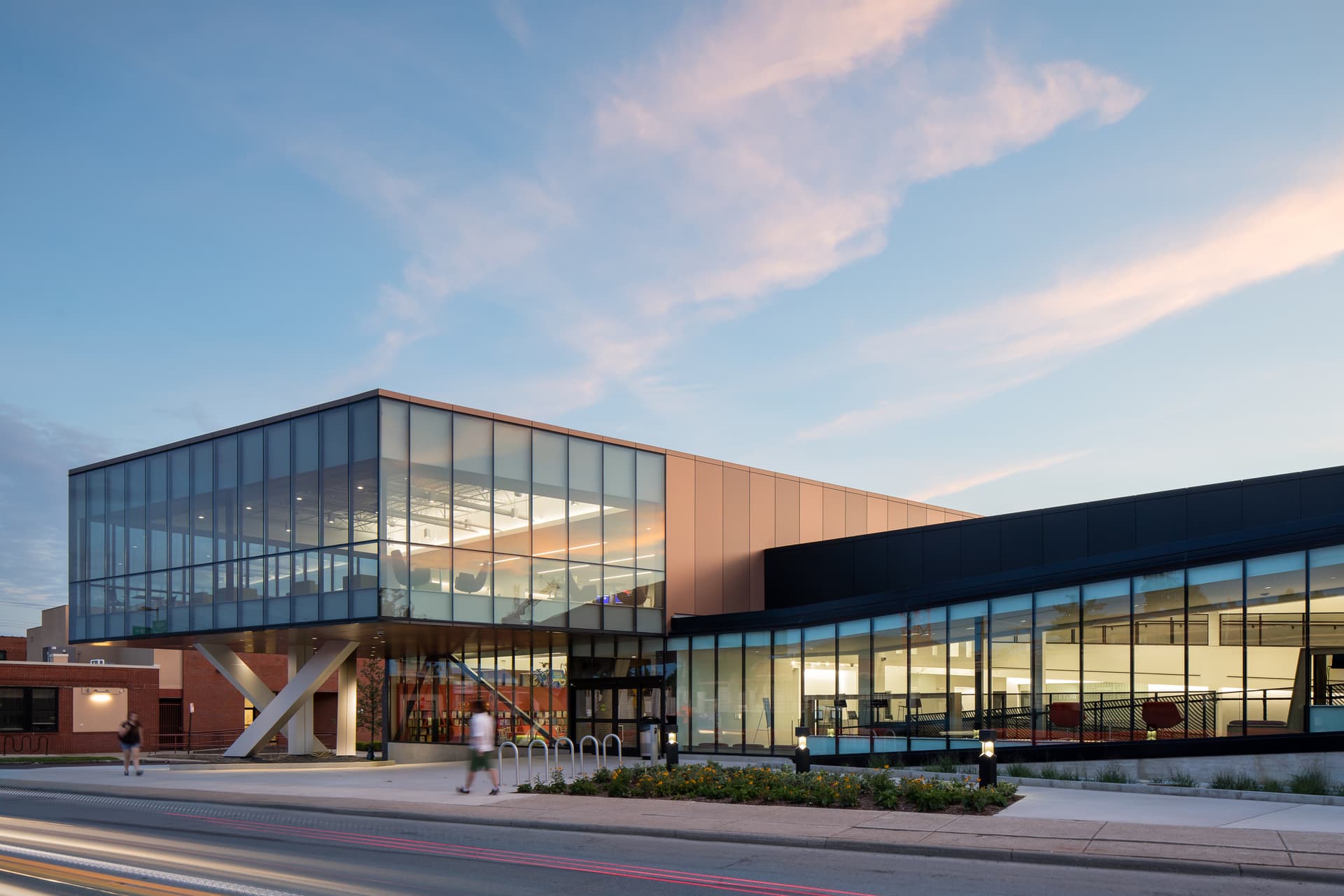 Northside Library serves as a civic anchor for the surrounding community—balancing quieter spaces for library stacks and reading nooks on the interior with more dynamic social and community spaces like a children’s area and meeting spaces along the exterior. The Northside branch’s social spaces ramp up to a dramatic cantilevered reading loft that engages the street, providing elevated views of the city and sheltering a public plaza.