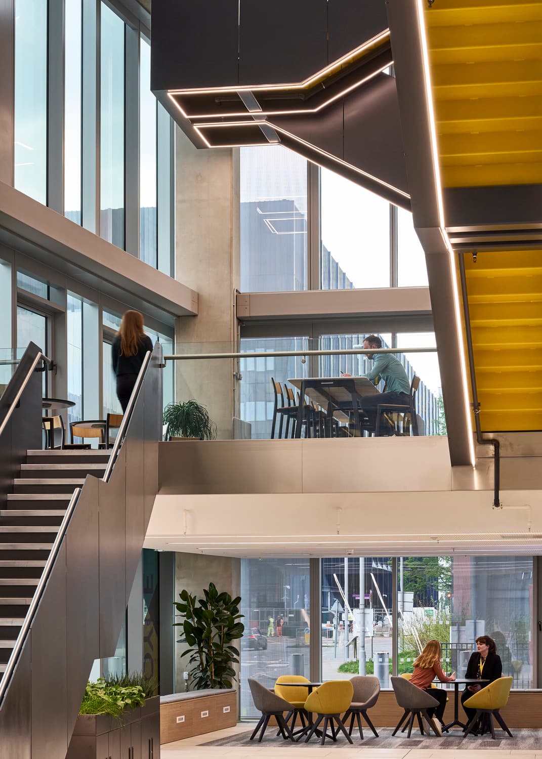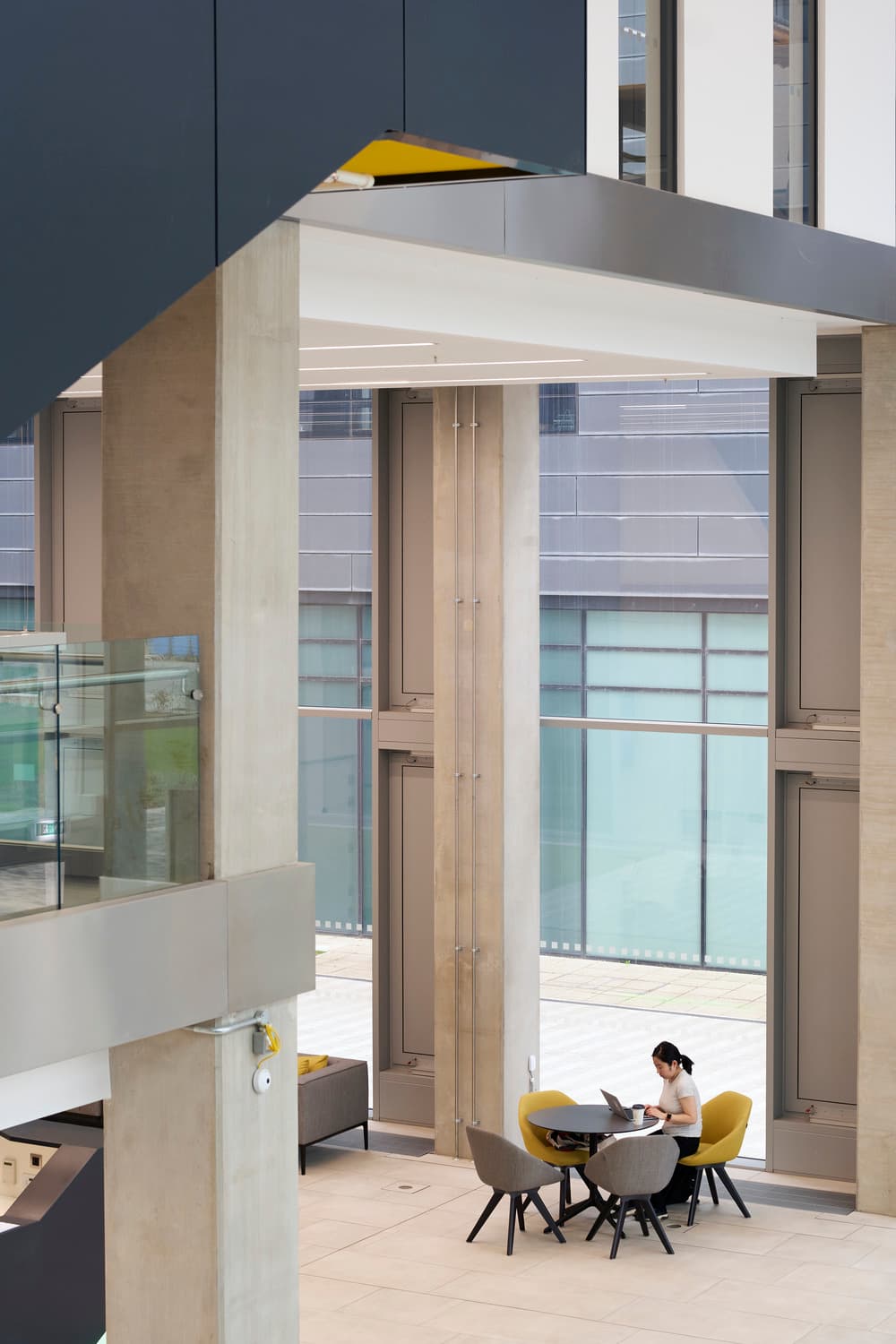 Located on campus at The University of Manchester, the Institute features seven floors with dedicated specialist spaces as well as open-ended write up areas, providing a flex zone which can be converted to additional laboratories, reacting to the changing needs of the materials research community. The building is also designed to balance solar gain against its functionality, resulting in a dynamic and engaging building presence. Vertical connections and shared spaces create opportunities for researchers and industry partners to mix across teams and generate new relationships and encounters with the aim of cross-fertilizing research.