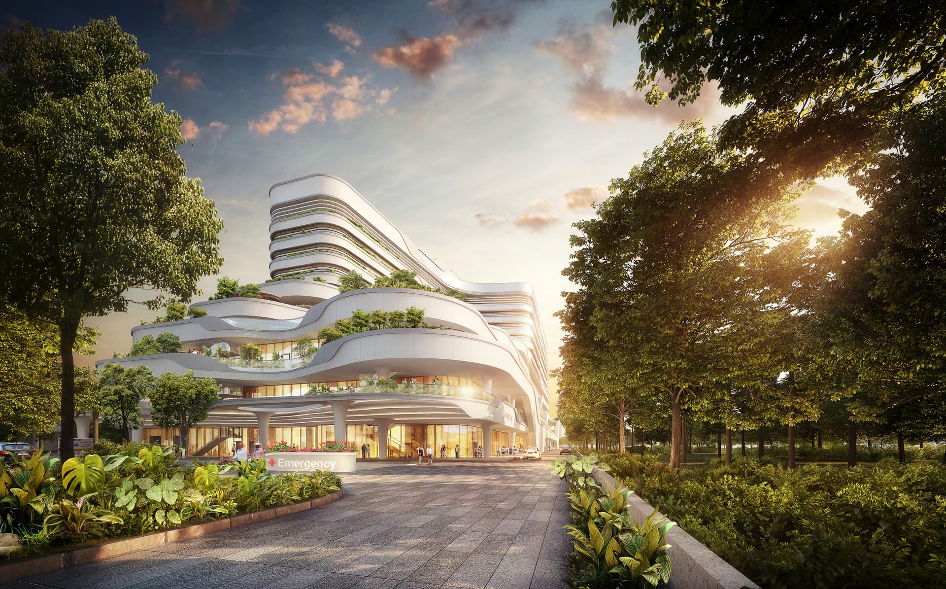 Predicated on the concept of “Healing Terraces,” the hospital’s design in inspired by the beautiful topographic qualities of Thailand, with a soft, fluid and organic architectural expression that seamlessly blends building and nature.