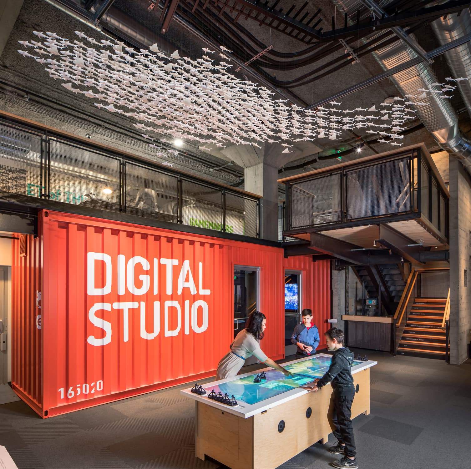 Physical and digital interactives, main exhibit floor, lab space, gift shop, lobby reception