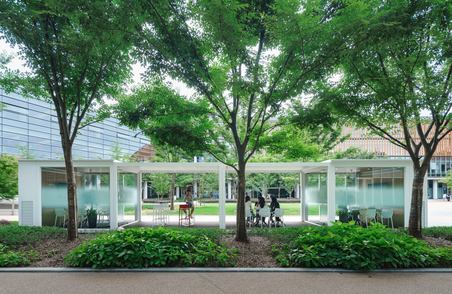 The campus employs a mixed office design that incorporates office and open spaces, courtyards, private conference rooms, communal seating areas and garden workstations to create a connected, productive community. Additional “green” features include rainwater harvesting, solar panels, a mechanical shading facade and immediate access to the city’s transportation infrastructure.